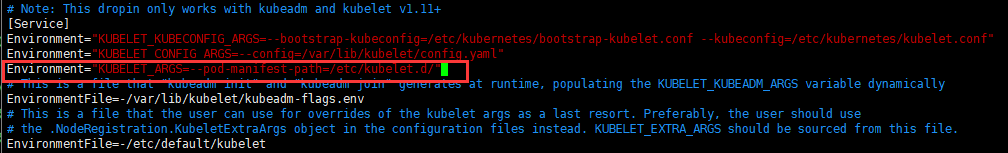添加`Environment="KUBELET_ARGS=--pod-manifest-path=/etc/kubelet.d/"`