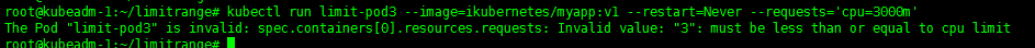 kubectl run limit-pod3 --image=ikubernetes/myapp:v1 --restart=Never --requests='cpu=3000m'