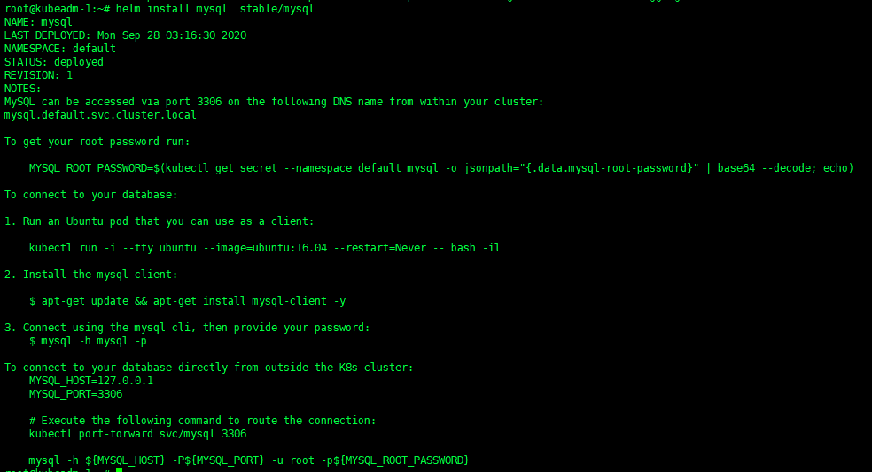 helm install mysql stable/mysql