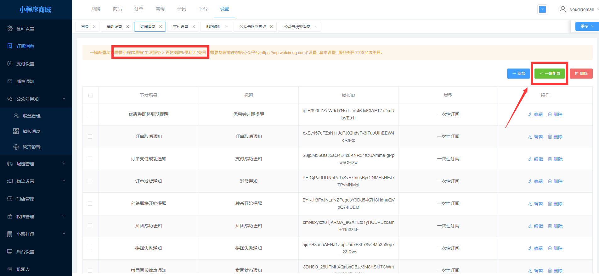 一键配置功能需要小程序具备“**生活服务 > 百货/超市/便利店**”类目,需要商家前往微信公众平台(https://mp.weixin.qq.com)“设置--基本设置--服务类目”中添加该类目。