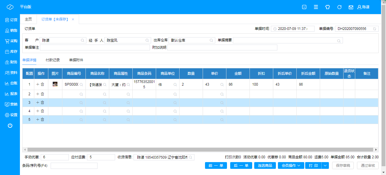 ·**单据详情**:必须为商品列表里现有的商品,击商品编号/商品名称即可搜索,数量、单价、折扣可按实际情况填写或更改;