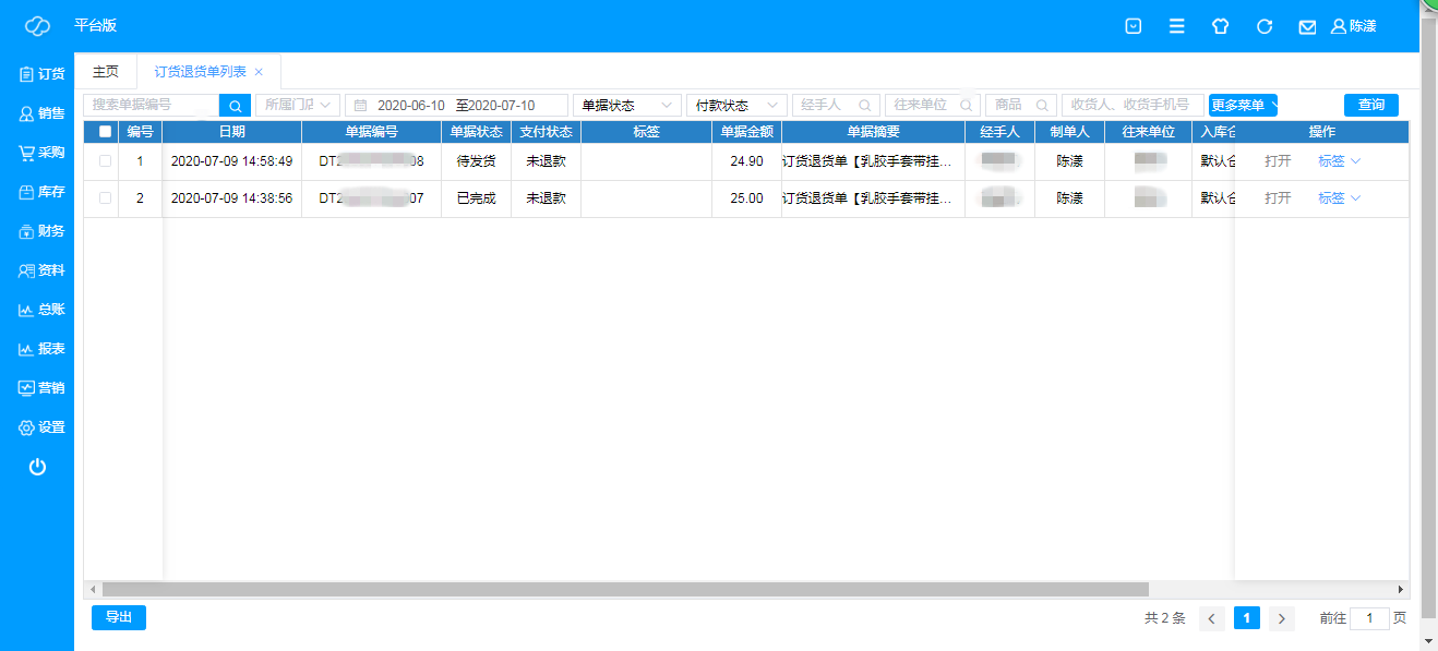 订货退货单列表用于查询或编辑退货单据信息,可根据订单编号,订单日期范围,单据状态(待审核/待出库/待发货/待收货/已收货/已取消/已完成/强制完成),付款状态(未付款,部分付款,已付款),经手人,往来单位,商品信息,收货信息,单据来源(管理端/客户端),设备等条件进行查询,可以导出单据,双击可查看明细账。