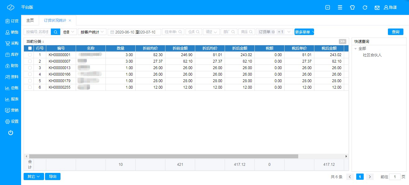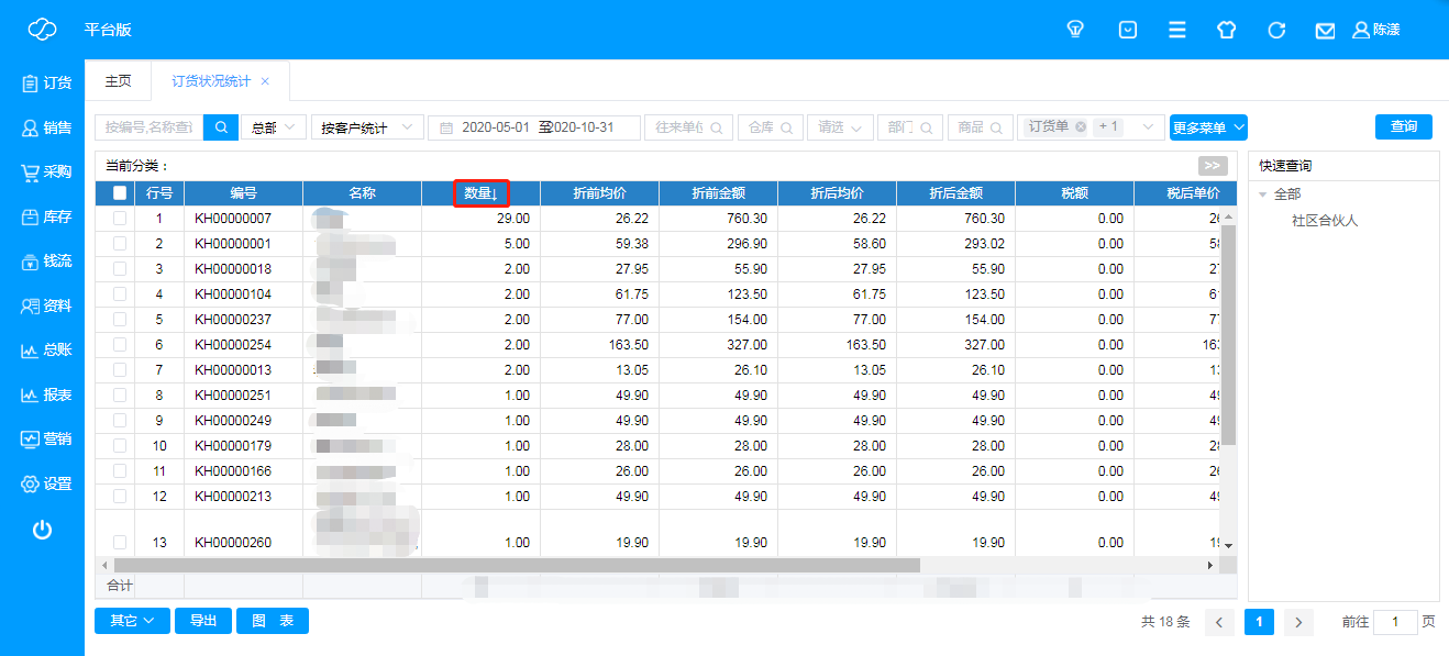 ·数据排序:点击“数量”、“折前金额”、“折后金额”可对数据进行排序,从高到低或者从低到高,重复点击可切换排序或取消排序;