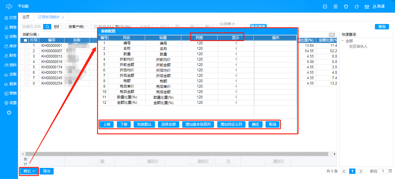 ·**其他**:可进行表格配置,根据实际需求,选择展示表格数据,也可对数据结果展示进行编辑,列宽,上下顺序等;