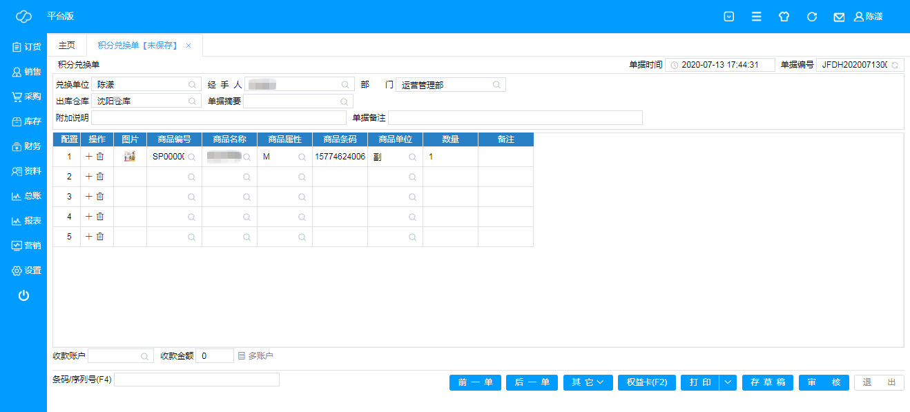 注:使用积分兑换单前,需要给商品设置兑换积分,否则自动默认兑换积分为0,设置方法请参考:资料—商品信息介绍;