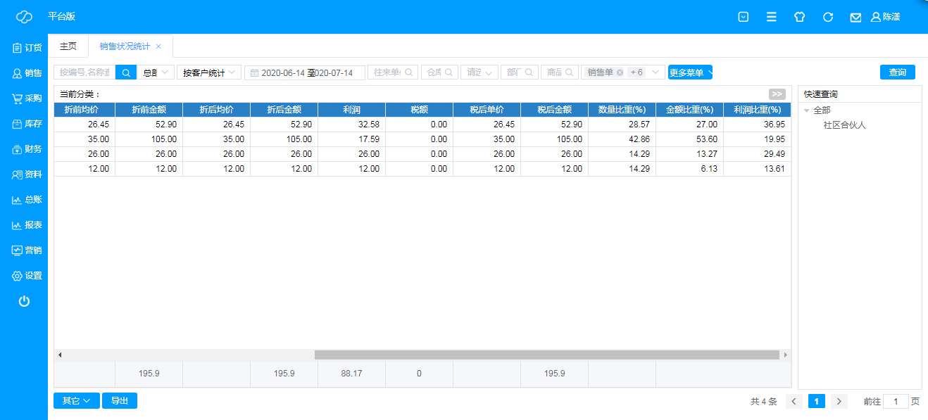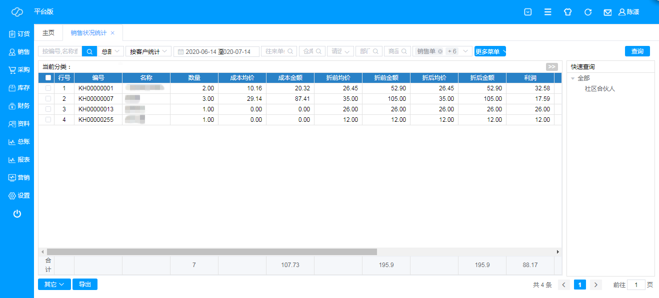 ·数据排序:点击“数量”、“折前金额”、“折后金额”、“利润”可对数据进行排序,从高到低或者从低到高,重复点击可切换排序或取消排序;