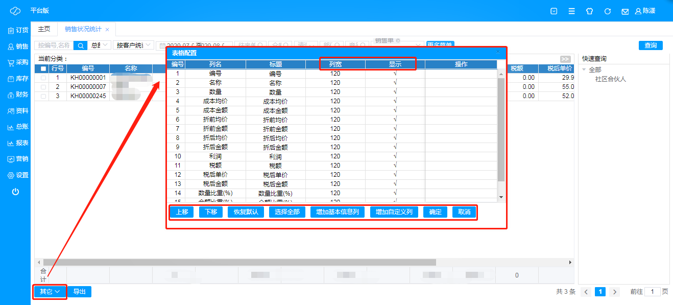 ·**其他**:可进行表格配置,根据实际需求,选择展示表格数据,也可对数据结果展示进行编辑,列宽,上下顺序等;