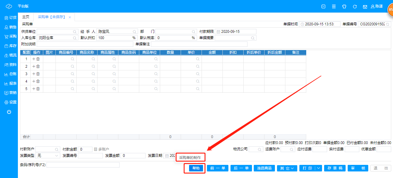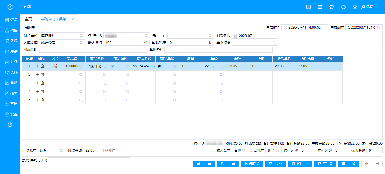 新建完商品需要做采购单,用记商品入库,相应信息填写完毕后,点击审核,采购单制单完成,可打印留存;