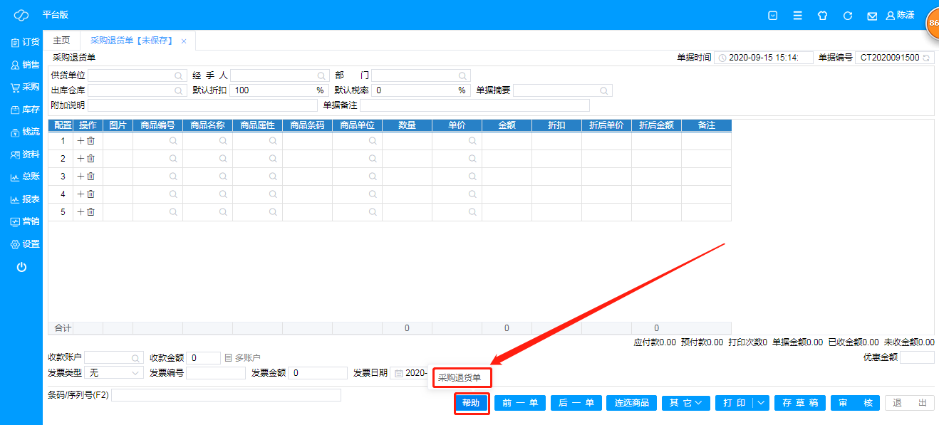 注:点击“帮助”可在线观看采购退货单的制作;