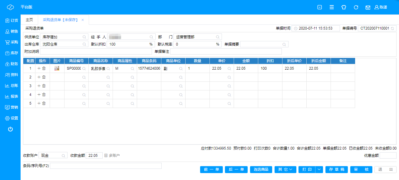 **·经 手 人**:必填项,即制单人,有该项操作权利的管理员/操作员;
