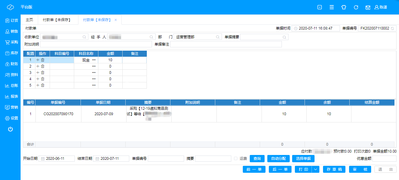 付款单给供应商结算的单据证明,搜索收款单位,可查看所有应付款供应商,选择结算供应商,选择结算单据,添加结算信息(结算科目+金额),点击审核,单据完成,可打印留存;