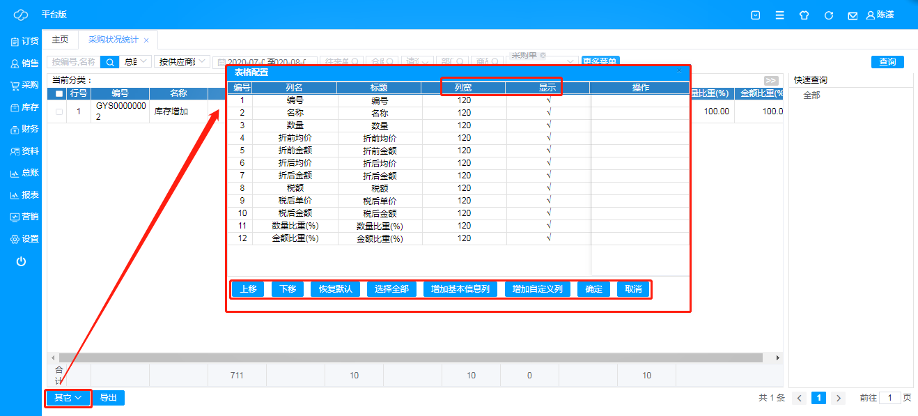 ·**其他**:可进行表格配置,根据实际需求,选择展示表格数据,也可对数据结果展示进行编辑,列宽,上下顺序等;