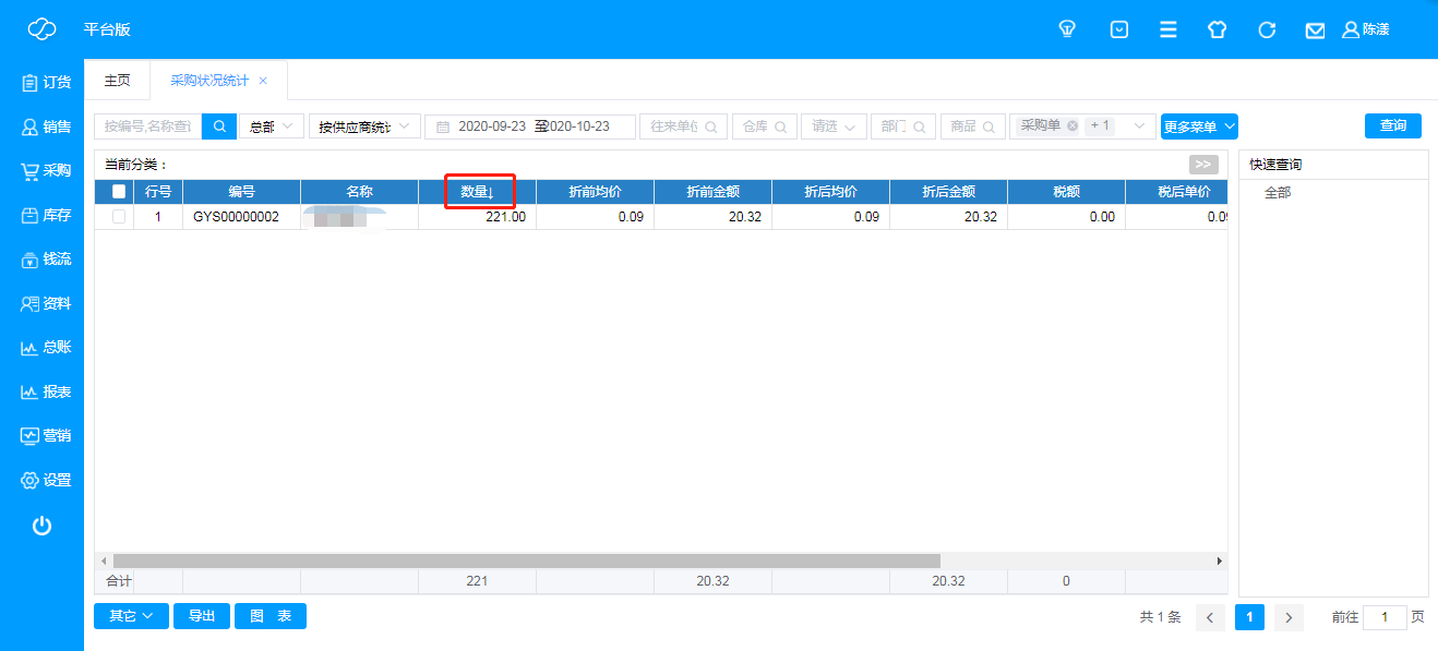 ·数据排序:点击“数量”、“折前金额”、“折后金额”可对数据进行排序,从高到低或者从低到高,重复点击可切换排序或取消排序;