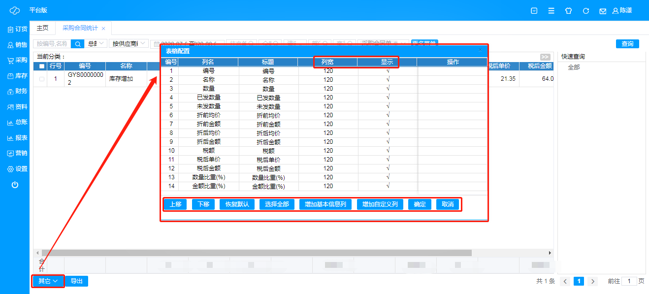 ·**其他**:可进行表格配置,根据实际需求,选择展示表格数据,也可对数据结果展示进行编辑,列宽,上下顺序等;
