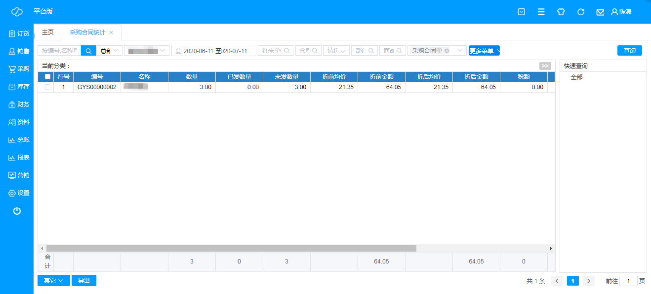 采购合同统计即所有采购合同单据统计表,可按照不同场景或者多个场景进行统计查看(按供应商/地区/经手人/部门/商品/仓库/货位)进行统计,可根据单据编号/各个场景名称,店铺(总店/自营店)、订单日期范围,往来单位,商品分类,仓库信息,部门信息,商品信息,单据类型(采购合同单),地区,经手人,货位等条件进行查询,双击可查看具体明细账,也可导出查看;