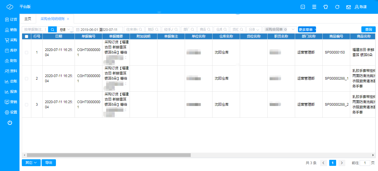 采购合同明细表即所有供应商的采购合同明细表,可按单据备注、摘要,店铺(总店/自营店)、订单日期范围,往来单位,地区,经手人,部门信息,商品信息,仓库信息,货位,商品分类,单据类型(采购合同单)等条件进行查询,双击可查看具体明细账,也可导出查看;