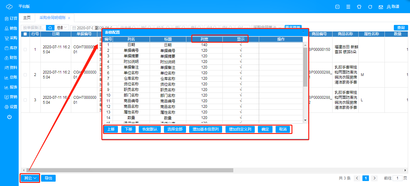 ·**其他**:可进行表格配置,根据实际需求,选择展示表格数据,也可对数据结果展示进行编辑,列宽,上下顺序等;