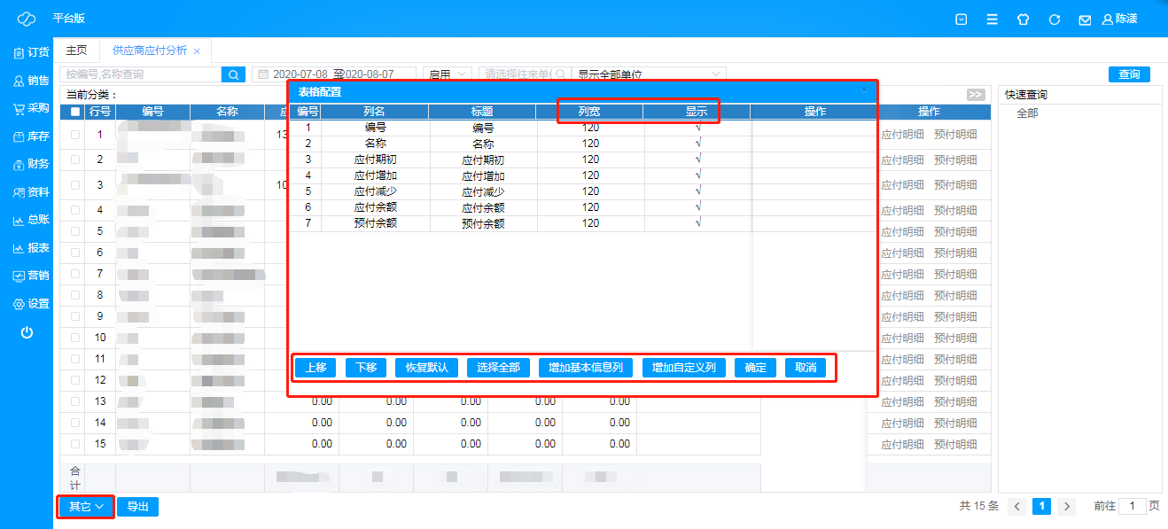 ·**其他**:可进行表格配置,根据实际需求,选择展示表格数据,也可对数据结果展示进行编辑,列宽,上下顺序等;
