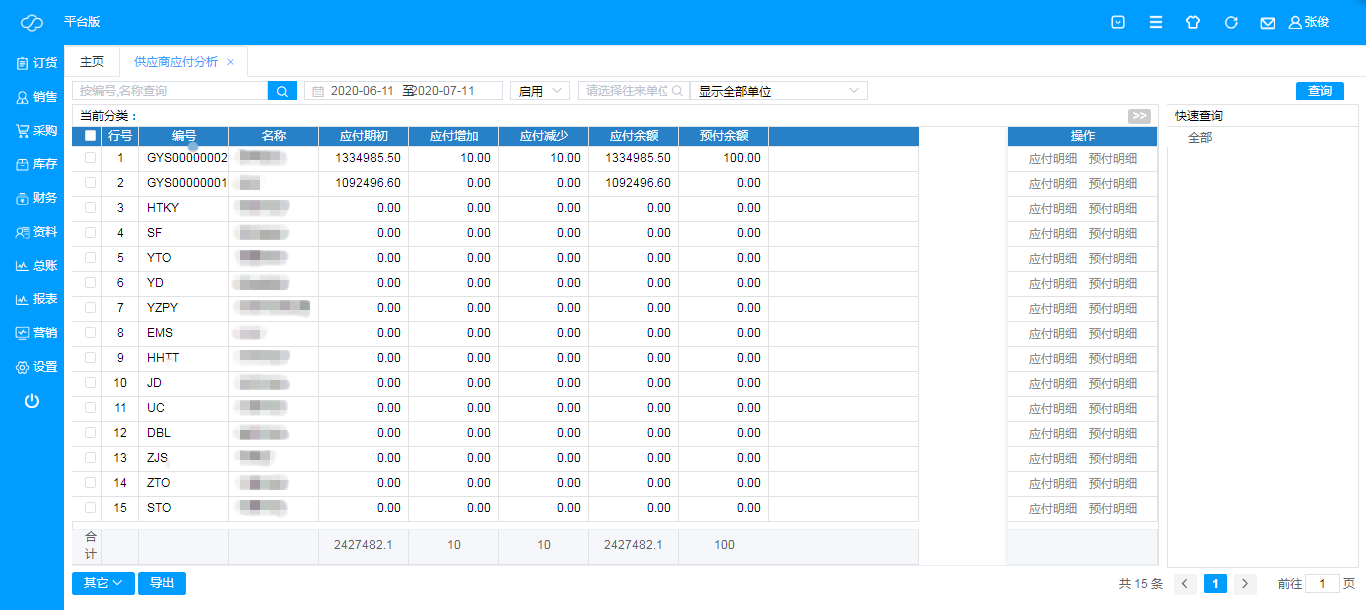 供应商的详细应付分析,含应付增加、应付减少、应付余额、预付余额等信息,一目了然,可根据编号、名称,单据日期范围,启用/停用供应商,往来单位信息,单位信息(显示全部单位/显示有业务单位/显示无业务单位)等条件进行搜索查看,点击操作:应付明细/预付明细可查看详细明细账,也可导出查看备份;