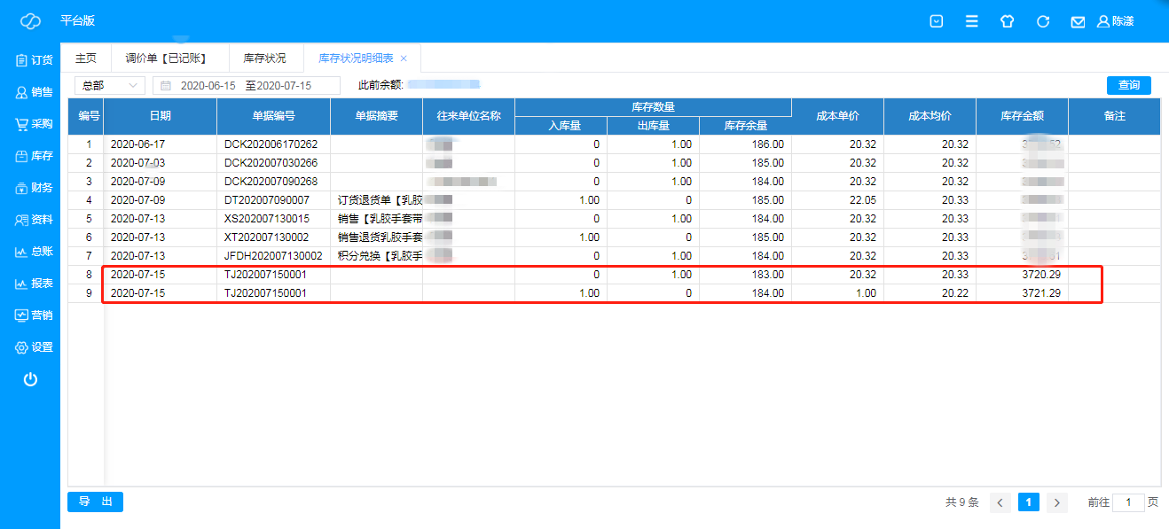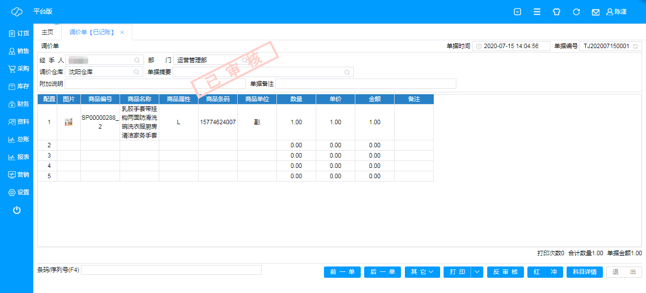 即在对应仓库中的商品进行调价的单据,制单完成后可在“库存—库存状况”中查看对应的商品的调价单,同一个调价单自动生成两个单据,一个为原价调零,一个为新调价格;