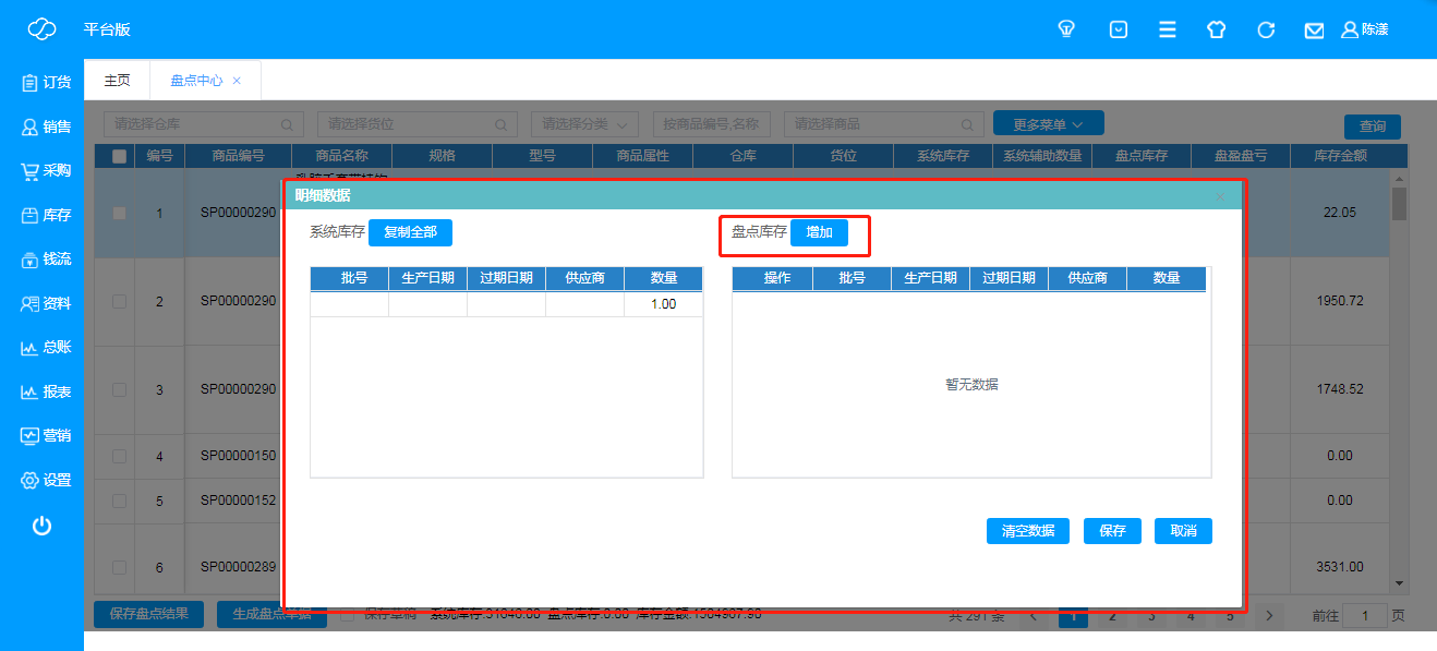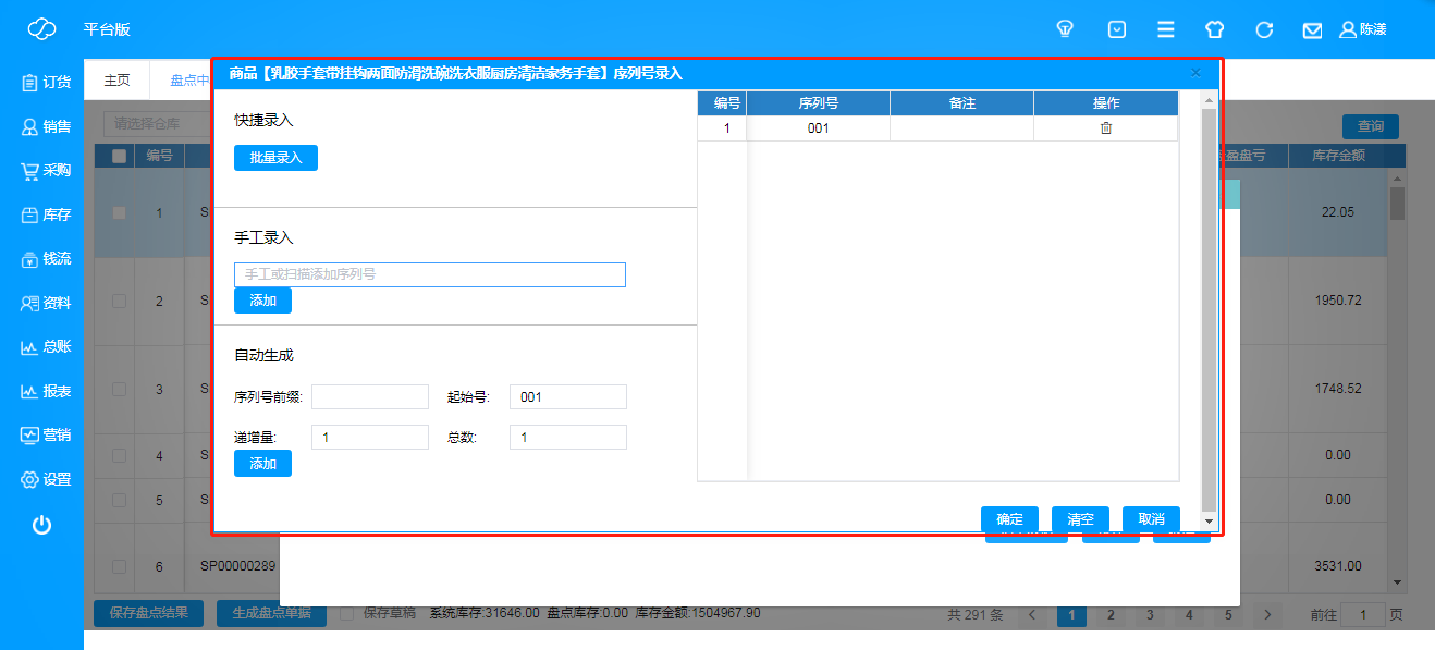 注:对有序列号的产品所在仓库进行盘点时,可以进行序列号盘点,可以手动输入或序列号扫码盘点;