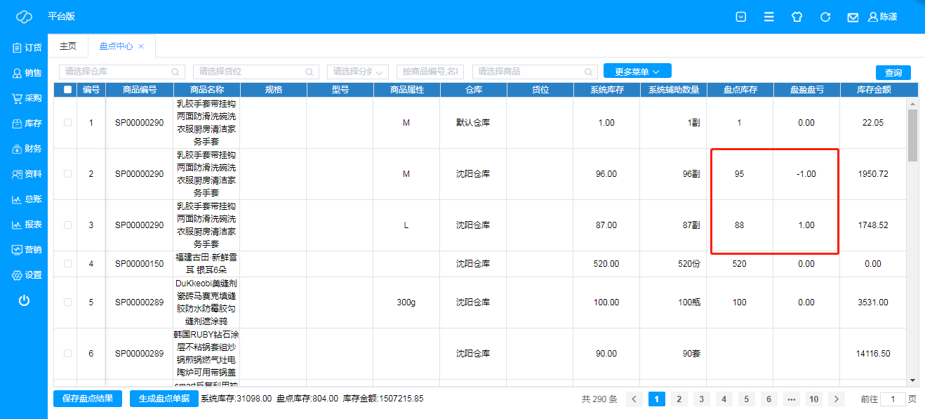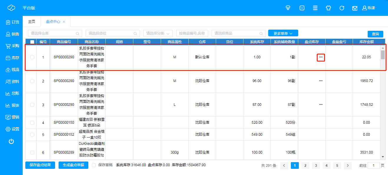 即进行实际仓库商品数据盘点记录表单,根据实际数量可直接计算盘盈盘亏,可根基仓库,货位,商品分类,商品编号/名称,商品搜索,是否停用,全部数据等条件进行筛选盘点;