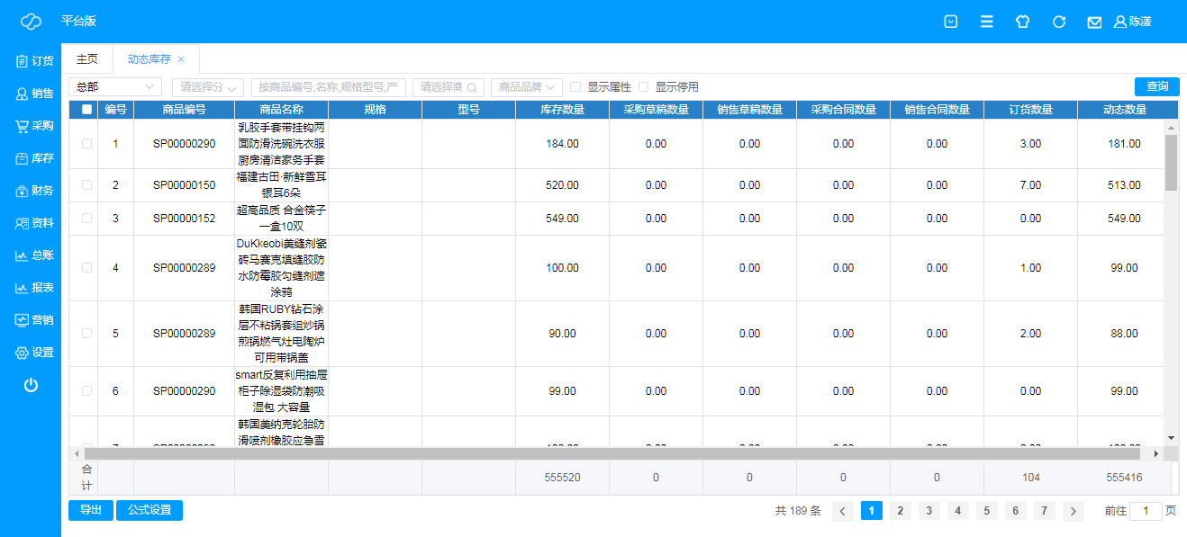 即所有商品的实际库存=总库存—所有订单(采购草稿数量/销售草稿数量/采购合同数量/销售合同数量/订货数量)的未出库库存,可根据店铺(总店/门店)、商品分类、商品基本信息(名称/编号/规格型号等)、商品品牌,以及产品属性,是否停用等查询,可以导出查看备份;
