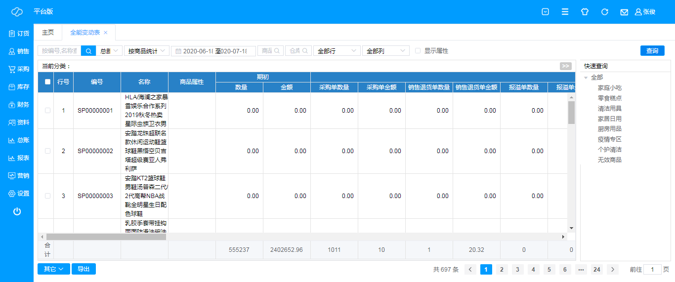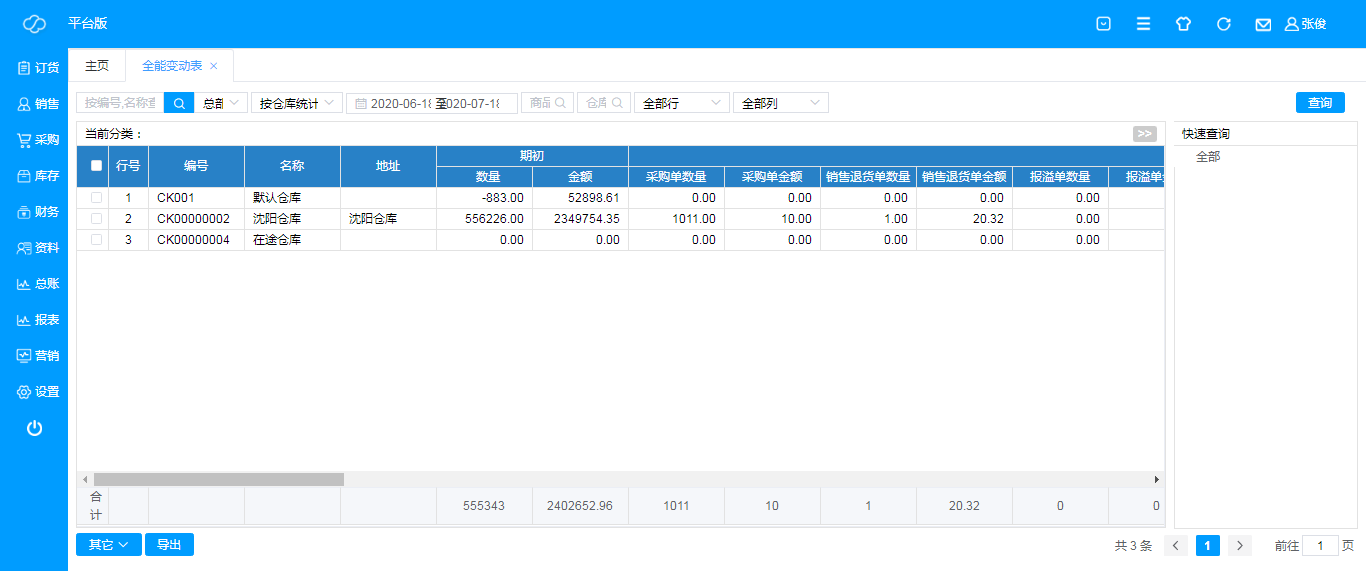 即商品实际库存的全部变化统计表,可根据仓库/商品的不同场景或多个场景进行查询,选定单据日期范围,即可查看在该单据范围内的所有单据变化明细表,可根据商品编号/名称、店铺(总部/门店)、单据日期范围、商品名称、仓库信息、是否变动行/列等信息进行查看,也可导出查看备份;