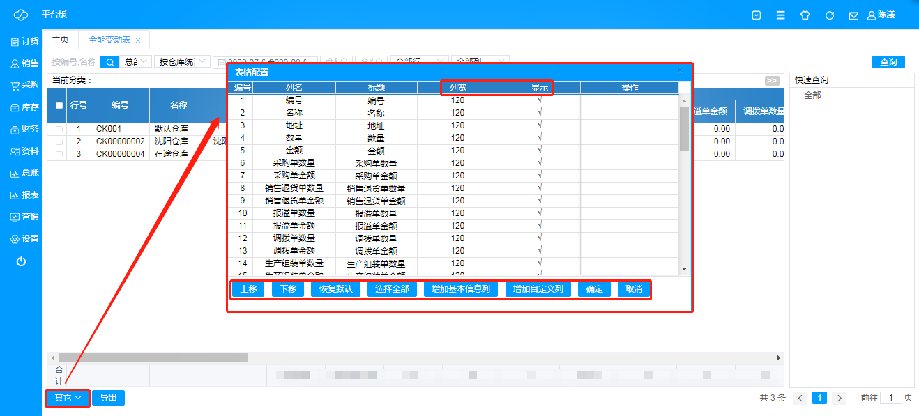 ·**其他**:可进行表格配置,根据实际需求,选择展示表格数据,也可对数据结果展示进行编辑,列宽,上下顺序等;