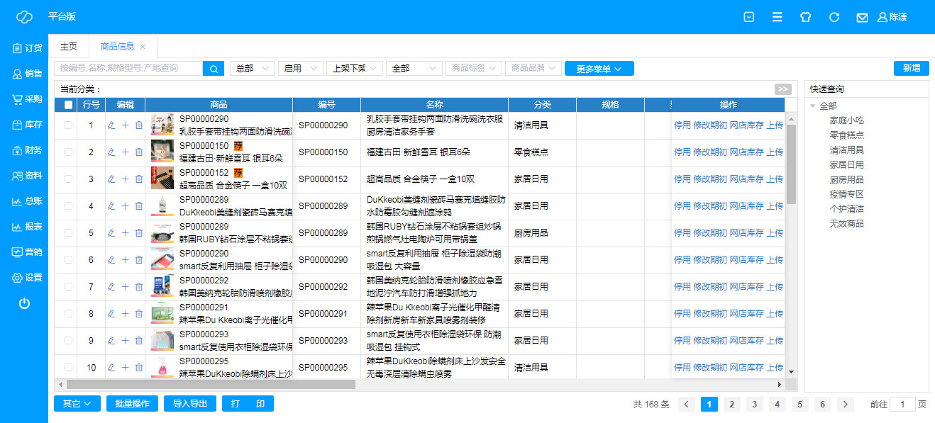 即所有商品列表,用于查看、新增等作用,可根据商品编号/商品名称/规格型号/产地、店铺(总部/门店)、启/停用、上/下架、商品标签、商品品牌等信息进行查询,也可以选择只显示有库存商品以及切换简易模式,点击“新增”可直接新增商品信息;