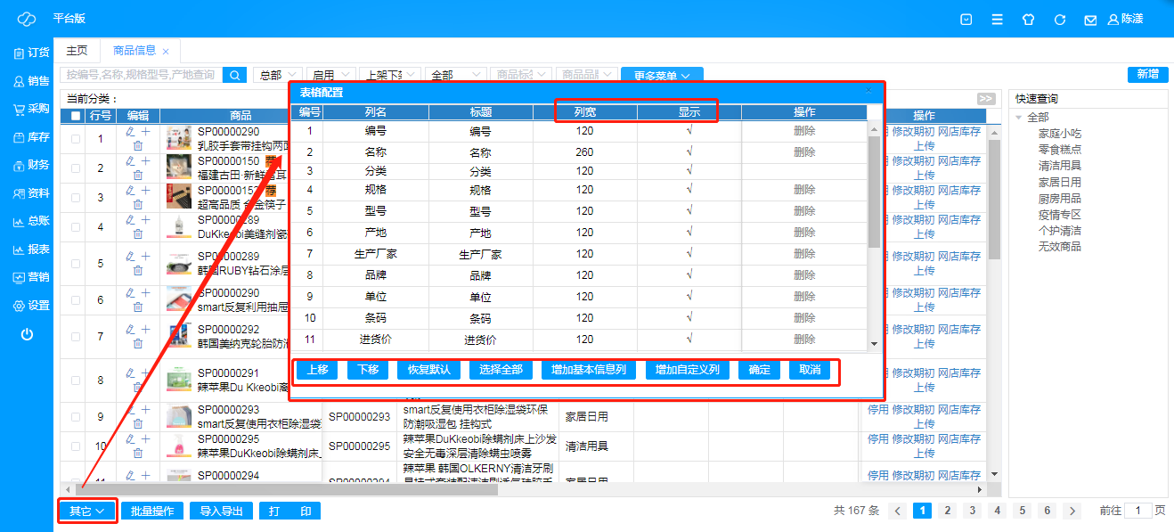 ·**其他**:可进行表格配置,根据实际需求,选择展示表格数据,也可对数据结果展示进行编辑,列宽,上下顺序等;
