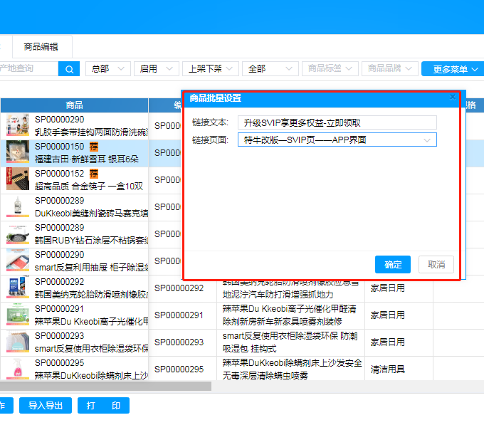 K、 批量设置链接:即批量设置所选中商品的公共区显示样式,可添加编辑文字,添加跳转页面,大多用于商城通用宣传的作用;