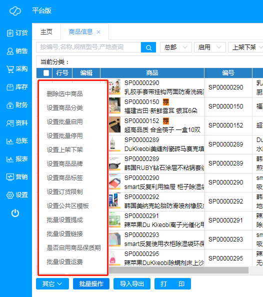 ·**批量操作**:已有商品可以进行批量操作,便于后期统一修改,包括以下可批量操作的功能;