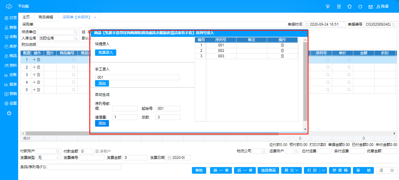 J:启用序列号:即对新采购的商品按数量进行排序列号,序列号是每个产品唯一的一组识别号码,主要适用于对单个产品把控比较严格的产品,例如:手机等;