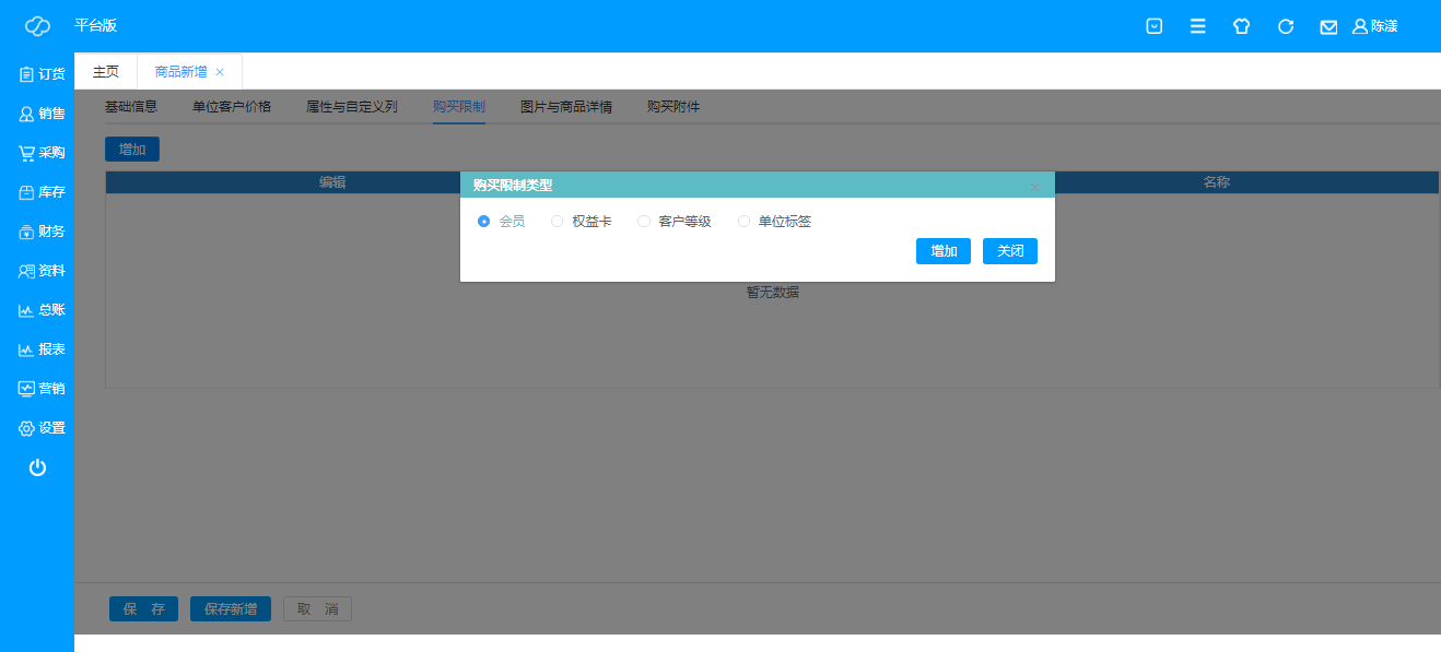 ·**购买限制**:即选择可购买该商品的客户身份,不添加默认所有可支付的客户都可以购买,添加购买限制后,只有已选择身份的客户才可以购买;