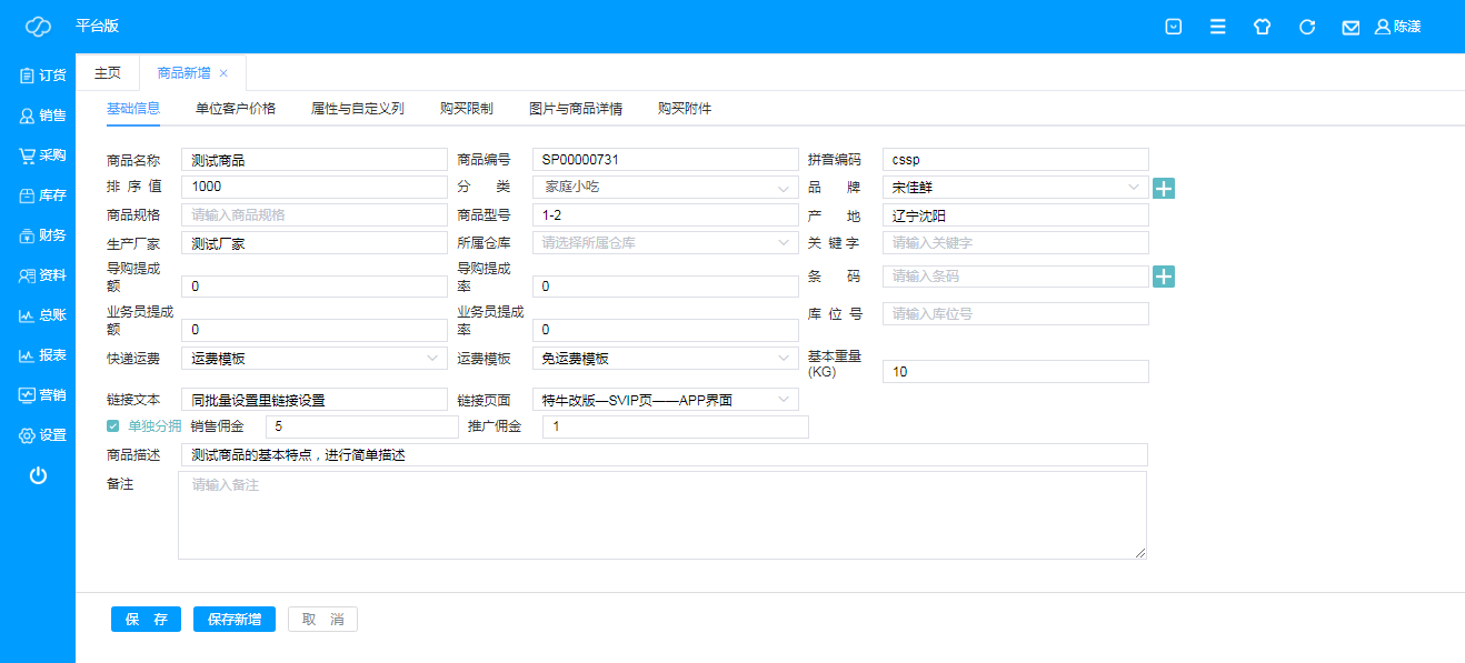 即新增商品信息,根据商品的基本信息,根据实际情况进行填写即可,商品信息分六个大部分: