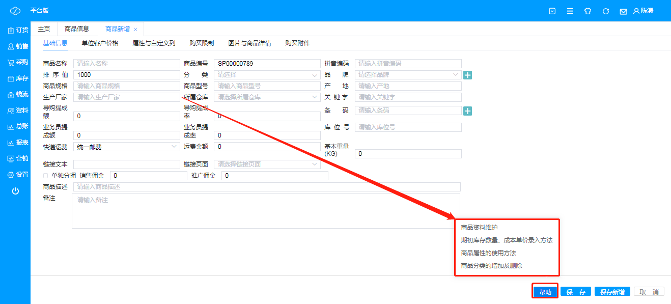 注:点击“帮助”可在线观看商品资料维护、期初库存数量、成本单价录入方法、商品属性的使用方法、商品分类的增加及删除;