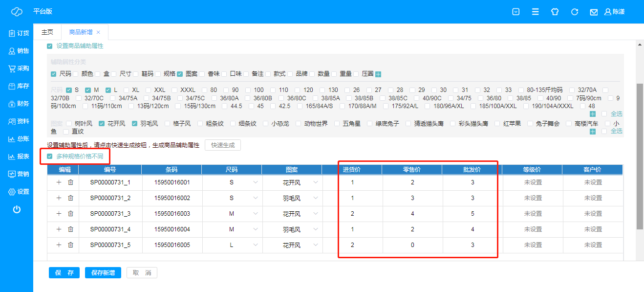 注:勾选多种规格价格不同,即可直接设置不同规格的商品的不同价格;