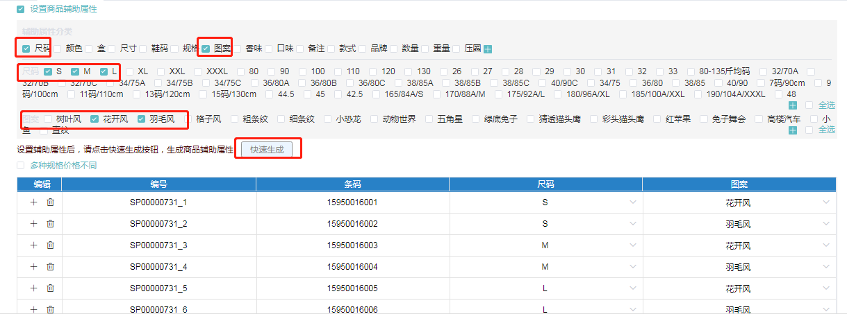 ·**属性与自定义列表**:用于设置商品的规格属性,勾选设置商品辅助属性,可直接设置商品属性,商品属性分类可直接新建,如颜色、尺码、图案等,勾选商品属性分类,即可新建属性下的详细规格,如黄色、37码、动物世界图案等等,勾选后,点击快速生成,商品属性建立完成;