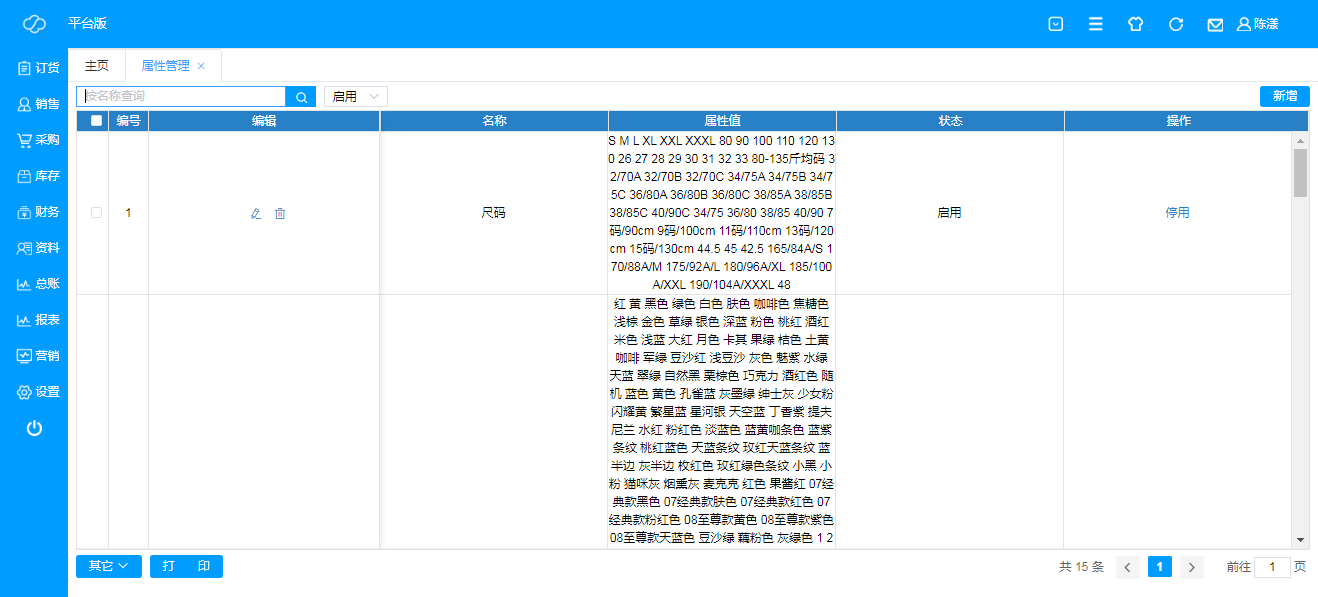 即所有商品的属性管理,可直接根据名称搜索,可编辑、新建或删除,也可以选择启用或停用;