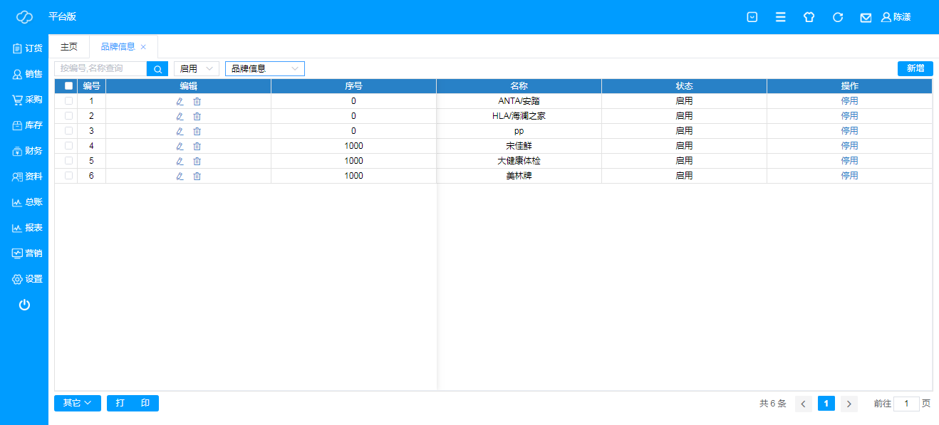 即所有商品的品牌管理,可直接根据名称搜索,可编辑、新建或删除,也可以选择启用或停用;