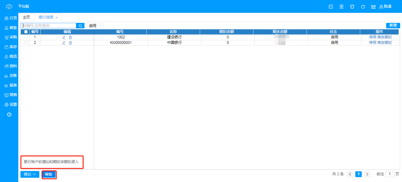 注:点击“帮助”可在线观看银行账户的增加和期初余额的录入;