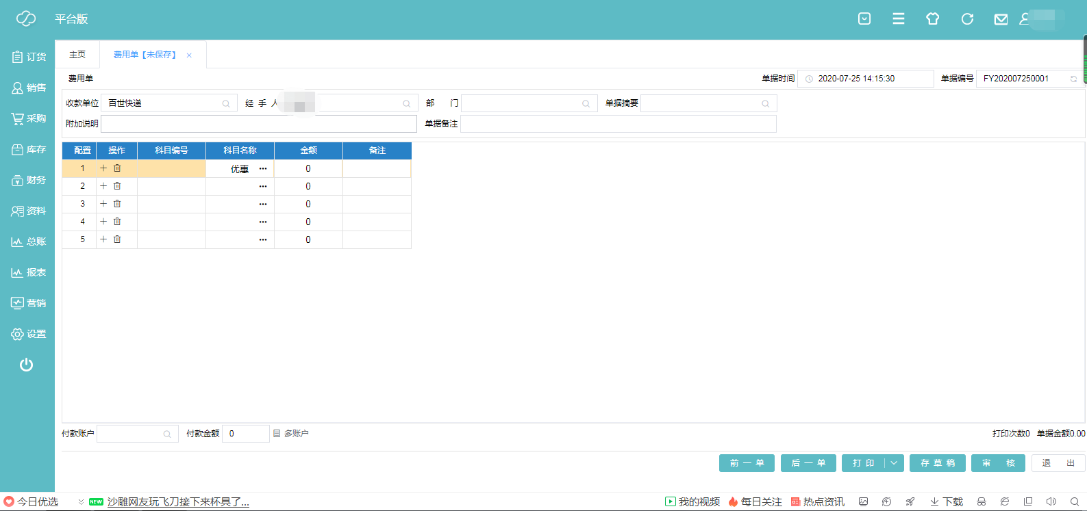 ·**收款单位**:费用报销形式下直接选择单位内部报销人员,直接付给卖方形式下选择卖方单位名称(选择之前如往来里没有对方或员工信息,则需先去资料板块下新增对方或员工信息);