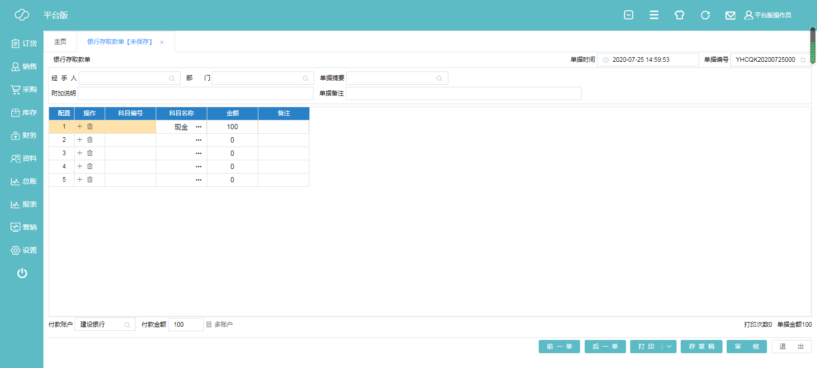 ·**科目名称**:如从银行取款,则科目选择取完钱存入的账户,下方付款账户选择支出钱的银行账户;如往银行里存款,则科目选择存入的银行账户,下方付款账户选择支出钱的账户;如把现金存到银行卡上,则科目选择存入的银行卡,付款账户选择现金;