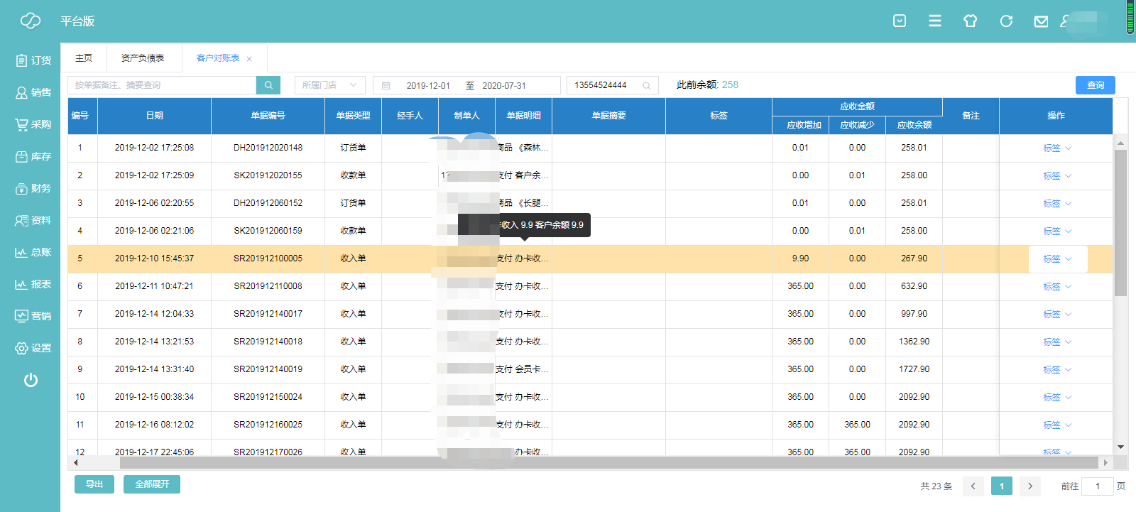 反映的是与客户之间的往来,包含客户充值、消费记录等客户订单明细,双击某一行进去可以查看往来明细,数据来源依据是销售及采购板块、财务板块下业务往来录入自动生成的(注:客户对账表是客户余额表中的余额数据的来源依据);