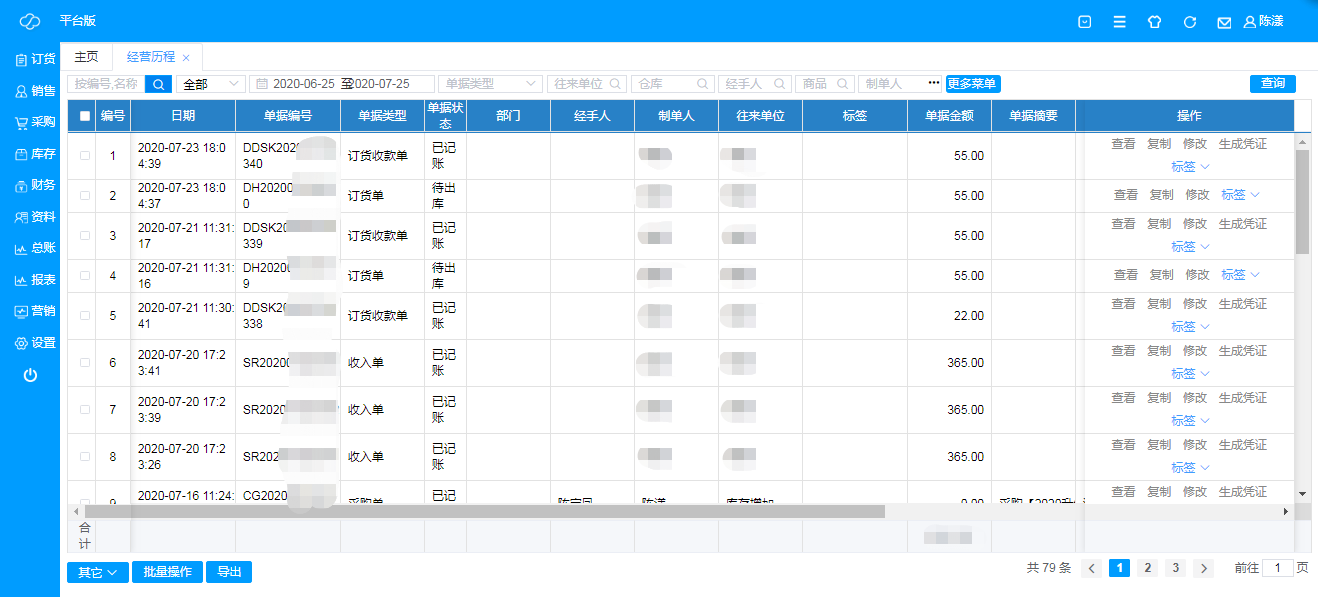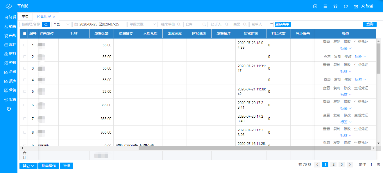 用于查看所有单据的信息梳理,双击即可查看所有单据的详细信息,也可以生成凭证以及导出表格进行备份查看,也可根据单据编号,名称、店铺、单据日期范围、单据类型、往来单位、仓库、经手人、商品信息、制单人、地区、货位、部门、收货人、单据来源、单据设备等信息进行查询;