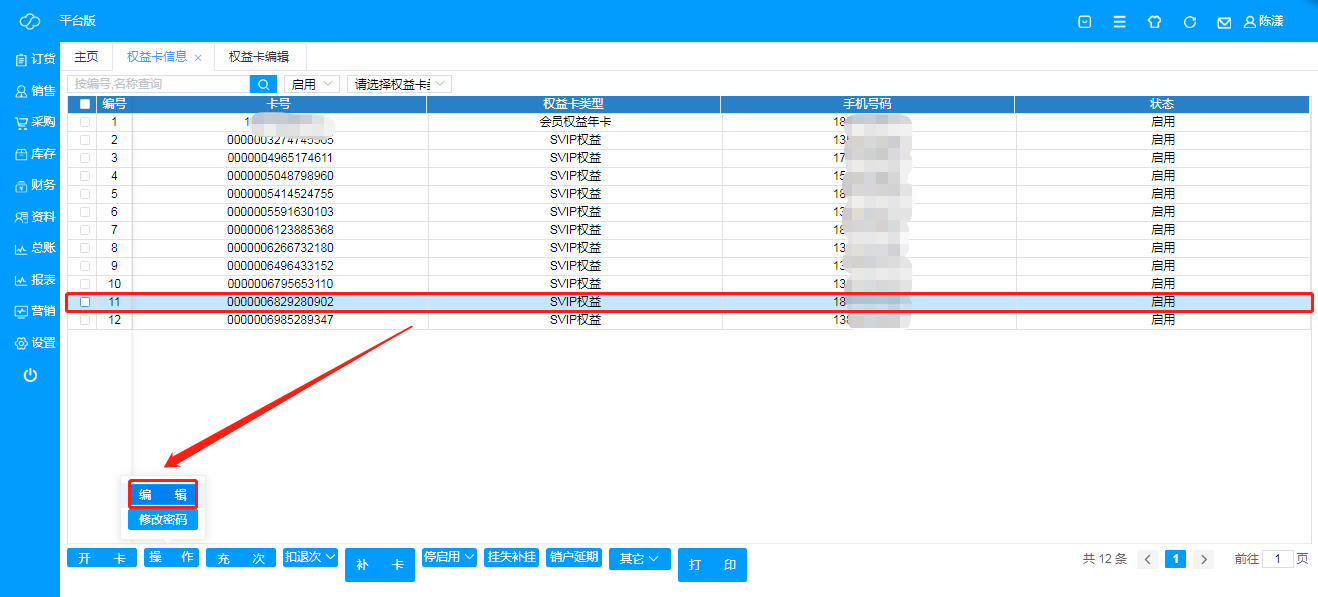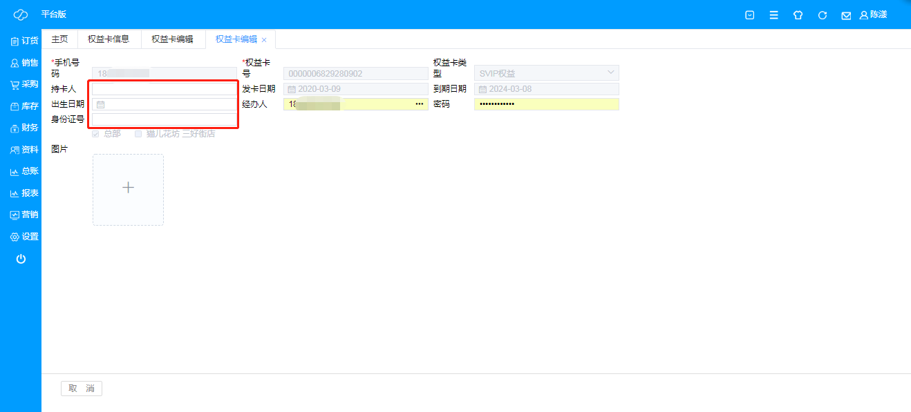 A、 编辑:可针对所有权益卡用户的详细信息进行编辑,持卡人,生日,身份证号等;