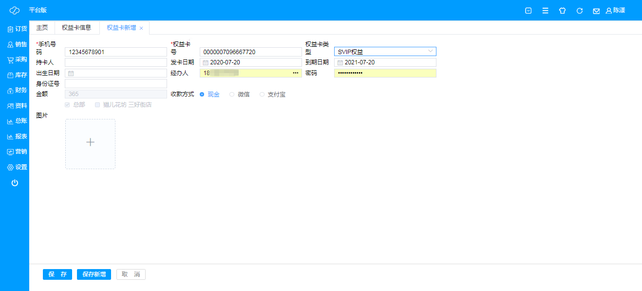 ·**开卡**:可直接给客户进行开卡,点击“开卡”,添加登录订货端手机号,选择权益卡类型,选择到期权益卡期限,选择收款方式,保存即可;