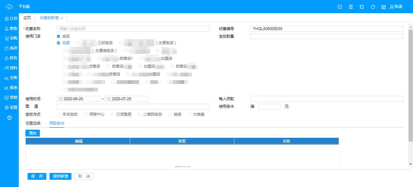 即查询和新建优惠券,点击“新增”即可新建优惠券,编辑优惠券名称,添加优惠券发放数量,选择优惠券使用门店,选择优惠券使用时期范围,设置每人限领优惠券数量,设置优惠券金额即使用条件,选择发放方式,也可以设置使用范围(全场/类别/品牌/标签/商品),设置领取条件(会员/权益卡/客户等级/单位标签)等;