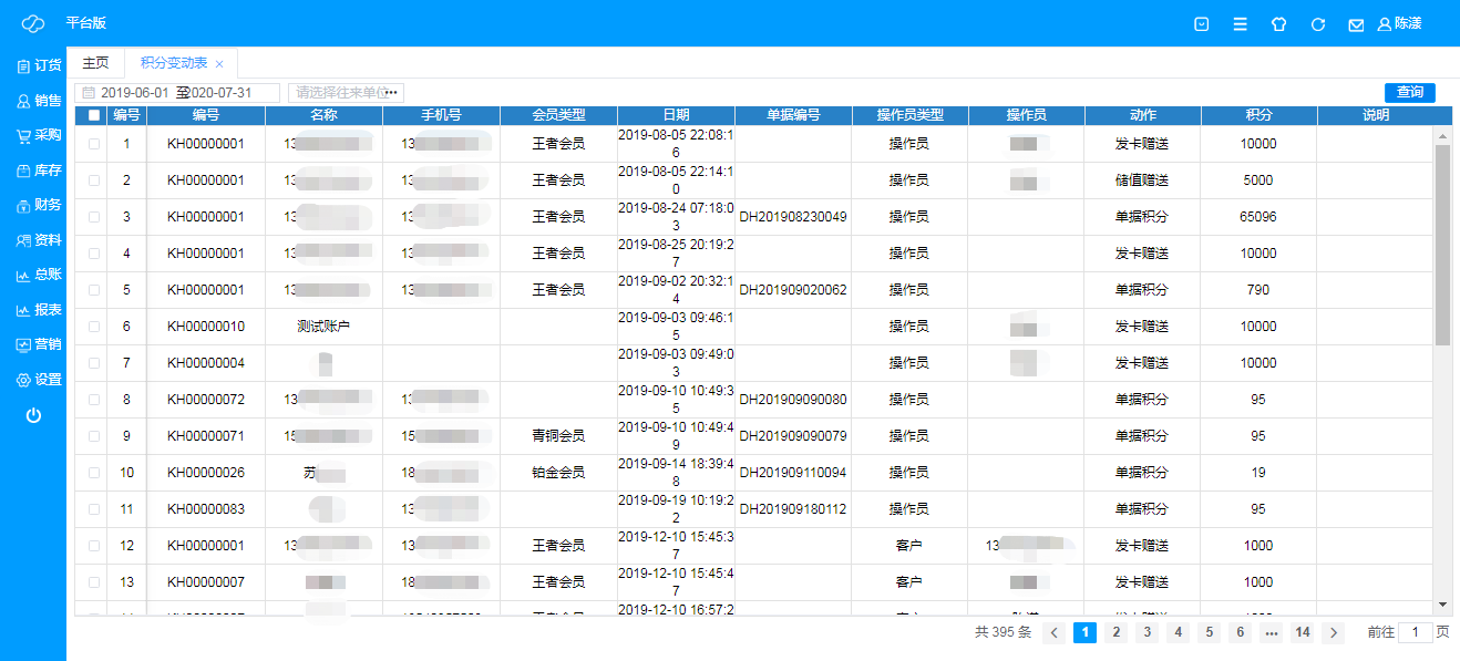 即查看所有积分变动表单,可根据单据日期范围及往来单位进行查询;